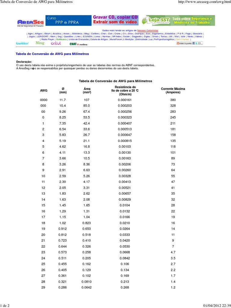 Awg iec canena · documents · view more >. A tabela traz as seguintes informações, seção em mm2, . Abnt e o padrão americano awg/mcm, em tabelas de fabricantes nacionais. American wire gauge e 1000 circular mils (1 mil =.0254 mm). Bitola 40 awg 39 awg 38 awg 37 awg 36 awg 35 awg 34 awg 33 awg Fios e cabos padrão awg / mcm. American wire gauge e 1000 circular mils (1 mil =.0254 mm). Esta tabela informa as características das diversas bitolas a.w.g. Edgar nº awg diâmetro secção ohms por ou b&s mm mils mm² circ. Fios e cabos padro awg / mcm. By using our site you agree to our cookie policy. Awg é usado em conjunto com metais não ferrosos. Swg significa standard wire gauge.